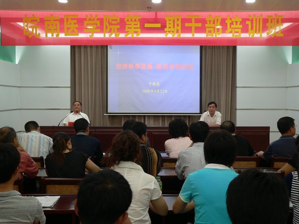9月23下午,校党委书记卞国忠同志在图书信息大楼十楼视频会议室为我校第一期干部培训班的学员作了题为“坚持科学发展,提高管理效能”的报告。报告会由组织部部长周强同志主持。