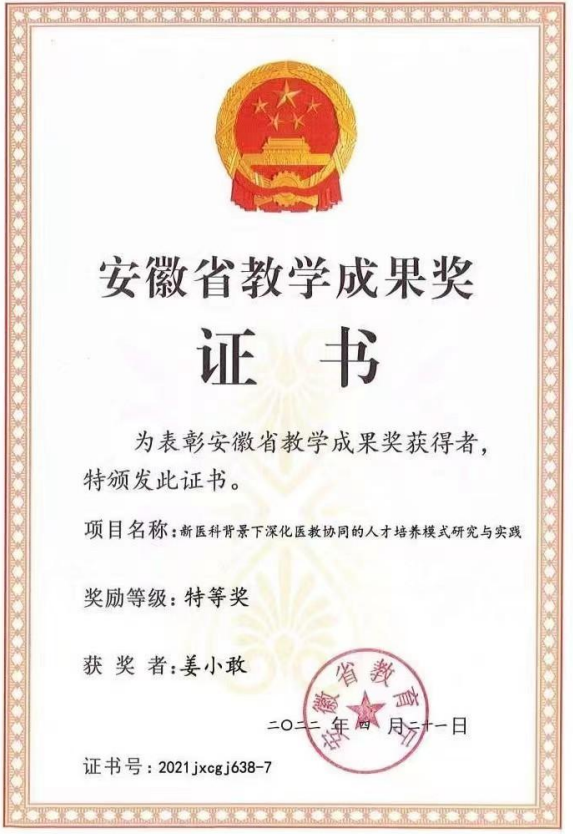 紧密围绕立德树人根本任务,以省“三全育人”综合改革试点院系建设为抓手,持续加强对学生的教育、引导和管理,促进学生全面发展。获全国大学生麻醉学知识竞赛一、二、三等奖各1项;“互联网+”创新创业大赛国家级铜奖1项,省级金奖1项、银奖2项、铜奖17项;“创青春”创业大赛国家级银奖1项、铜奖1项,省级金奖3项、银奖1项、铜奖11项;“挑战杯”课外学术科技作品竞赛国家级三等奖1项,省级一等奖2项、二等奖5项、三等奖5项;第十届“挑战杯”安徽省大学生课外学术科技作品竞赛红色专项14人次获奖;先后获批25项国家级、74项省级和14项校级大学生科研项目,本科生发表学术论文5篇。1名同学获团中央健康扶贫活动“先进个人”称号,2名同学获评中共安徽省委组织部、共青团安徽省委员会、安徽省学生联合会开展的纪念“五四运动”红色信息征集评选活动二等奖,1人获全国“大学生讲思政课”比赛一等奖,获“学习马克思主义理论成果大赛”省级三等奖1项,全国大学生英语竞赛C类比赛5人次获奖,“外研社杯”全国英语演讲大赛3人次获安徽省奖项。3名学生积极献血被实习医院发文表彰,1名学生勇于救人被地铁站致谢并赠送锦旗,2名同学获市级志愿服务“先进个人”。