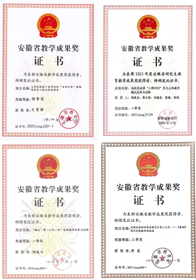 二是育人模式更趋完善。立足医学特色,构建“德润良医”育人品牌,打造“四课堂”融通机制。相关典型经验被《光明日报》《安徽教育》等主流媒体、政府内参报道和收录。深化课程思政改革,《大思政视域下医学院校“五纬并进”课程思政育人模式实践探索》等思政育人模式获批安徽省教学成果奖特等奖和一、二、三等奖各1项。