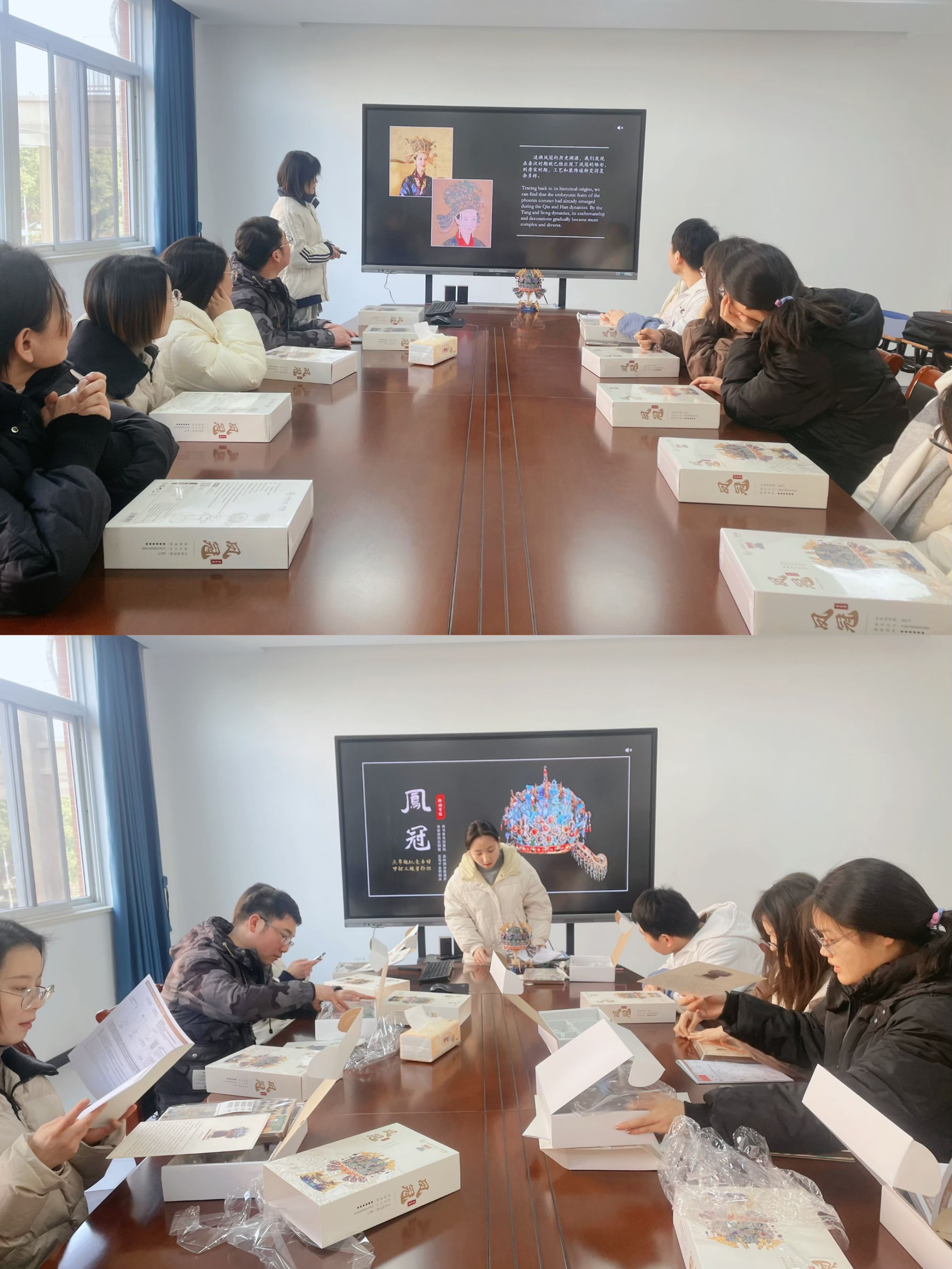 活动上,师生一起中英双语学习了解了凤冠制作的起源与发展。孝端皇后九龙九凤冠,重达2320克,上有以累丝工艺制作的金龙九条,均口衔珠滴,珠滴由一红一蓝两个宝石间两颗珍珠串成;其下为九只点翠工艺制作的凤鸟,同样口衔红蓝宝石珠滴;口圈一周有“金宝钿花”12个,冠上有48个,全冠共计金宝钿花60个,“金宝钿花”是由黄金、宝石、珍珠组合而成的花型装饰;其间“铺翠”,有翠云、翠叶、株翠花等装饰满铺在冠上。冠两侧后方为“博鬓”,是专门表示尊贵身份的假鬓,行走时会随着身体的摆动而展开。