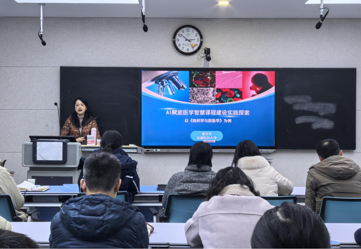 为进一步推进我校教育教学数字化转型,促进人工智能赋能医学教育创新发展,提升教师数字素养和数字化教研创新能力,1月16日下午,教务处在1号教学楼智慧教室举办“AI赋能医学智慧课程建设实践探索”专题培训会。本次活动邀请了国家医学示范课程负责人、全国高校教师教创赛二等奖获得者安徽医科大学谢芬芬副教授作专题报告。本次培训采用线上线下相结合的形式举行,各教学单位近三年新进教师、省级课程建设负责人等400余名教师参加培训。