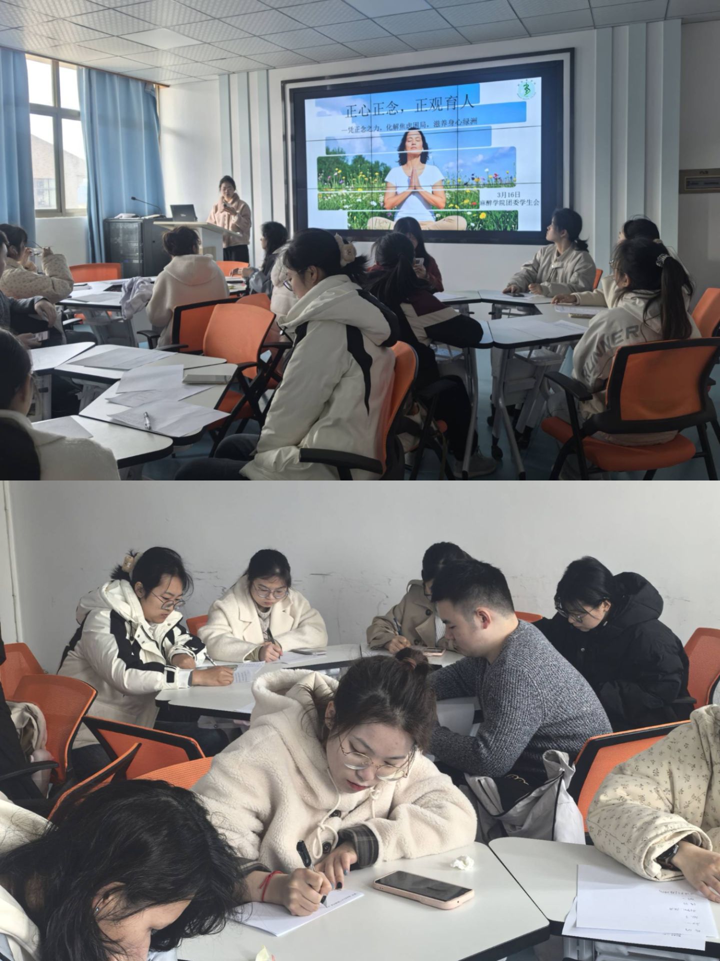 正观正念:筑牢职业发展心理之基。3月18日,正念训练营活动在麻醉学院实验实训中心会议室成功开展。针对医学生面临的学业和实习压力,活动通过专业人员带练,助力麻醉学院学生放松身心,掌握正念技巧。活动伊始,学生们通过填写心理调查问卷了解自身心理状况,随后跟随“正念””静观“带练视频进行放松训练,最后,齐声朗读、抄写“正念的七个态度”。活动有效缓解了医学生的心理压力,培育了正念思维,提升了心理韧性,为他们未来的职业发展筑牢了心理根基。