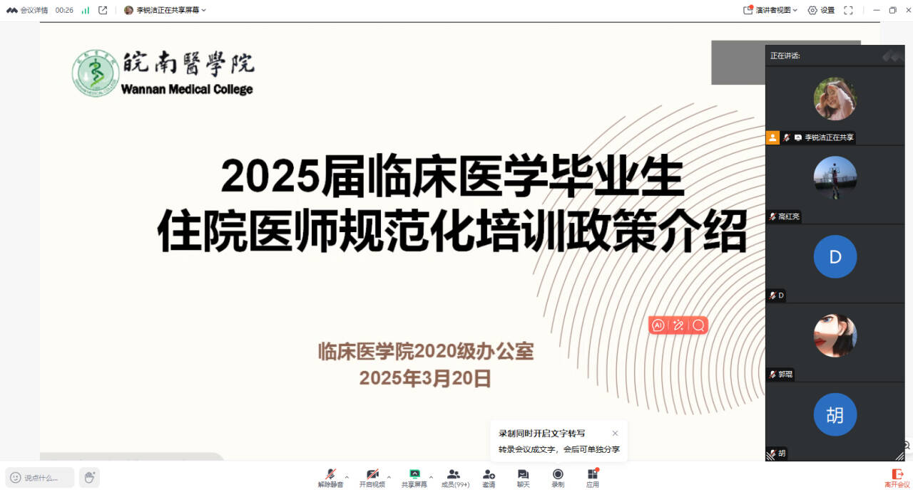 为扎实推进医学人才培养与就业衔接工作,帮助临床医学专业毕业生更好地了解住院医师规范化培训政策,3月20日,临床医学院举办住院医师规范化培训政策专题宣讲会。宣讲会通过线上直播的方式开展,共有160余名应届本科生参加。