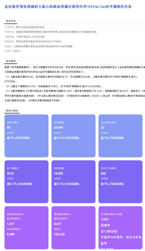 韩军教授以第一作者发表的论文《金丝桃苷预处理减轻大鼠心肌缺血再灌注损伤作用与PI3K/Akt信号通路的关系》文献总被引频次为 90,其中被核心期刊引用频次为 37,PCSI指数为 24.640,文献总被引频次在“中药学”领域排名前1%(37/25286);文献总下载频次为3310,PDSI指数为19.852,在“中药学”领域排名前0.1% (14/25286)。文章的入选对提升我校国内外学术影响力产生了积极的推动作用。
